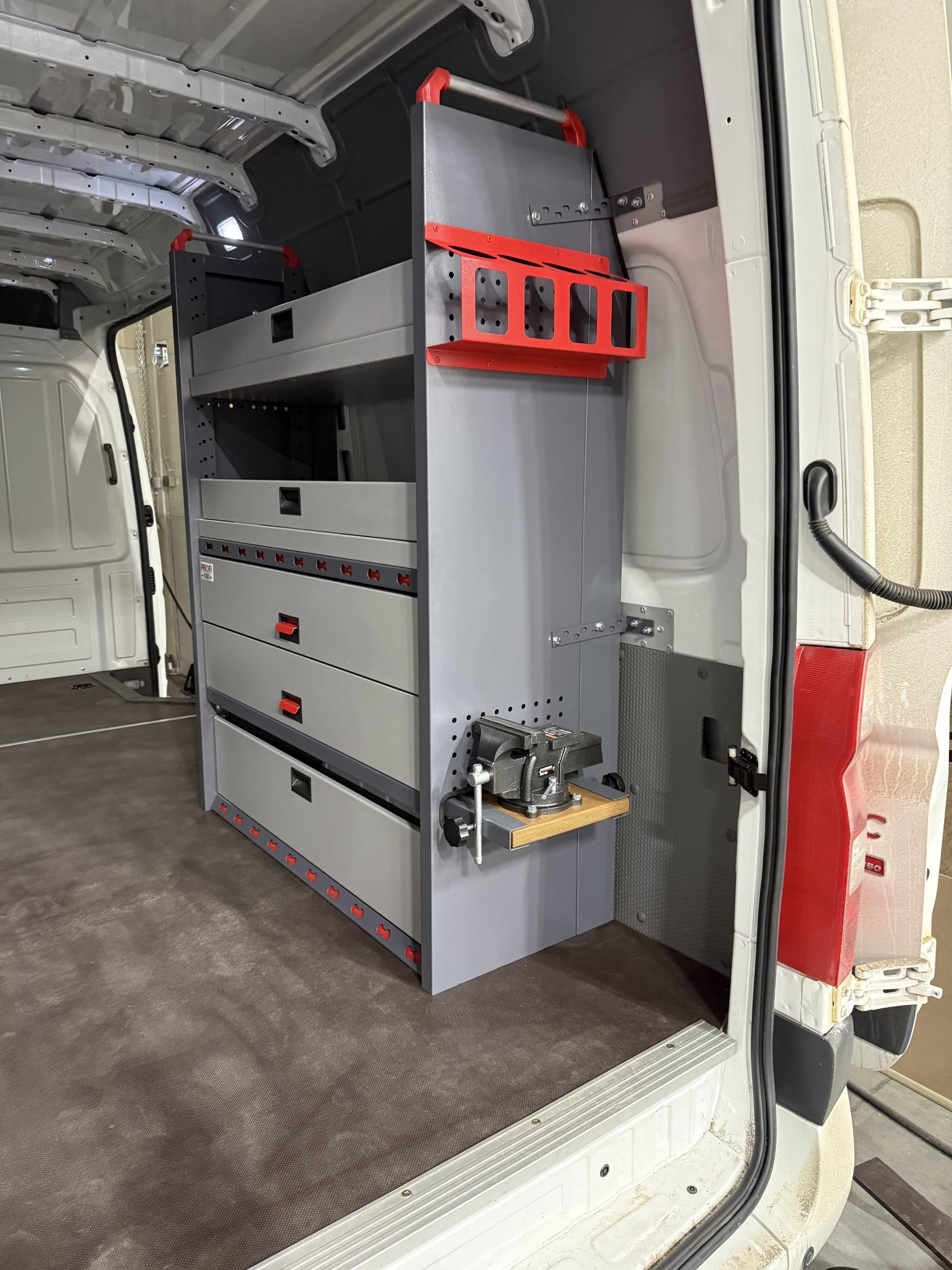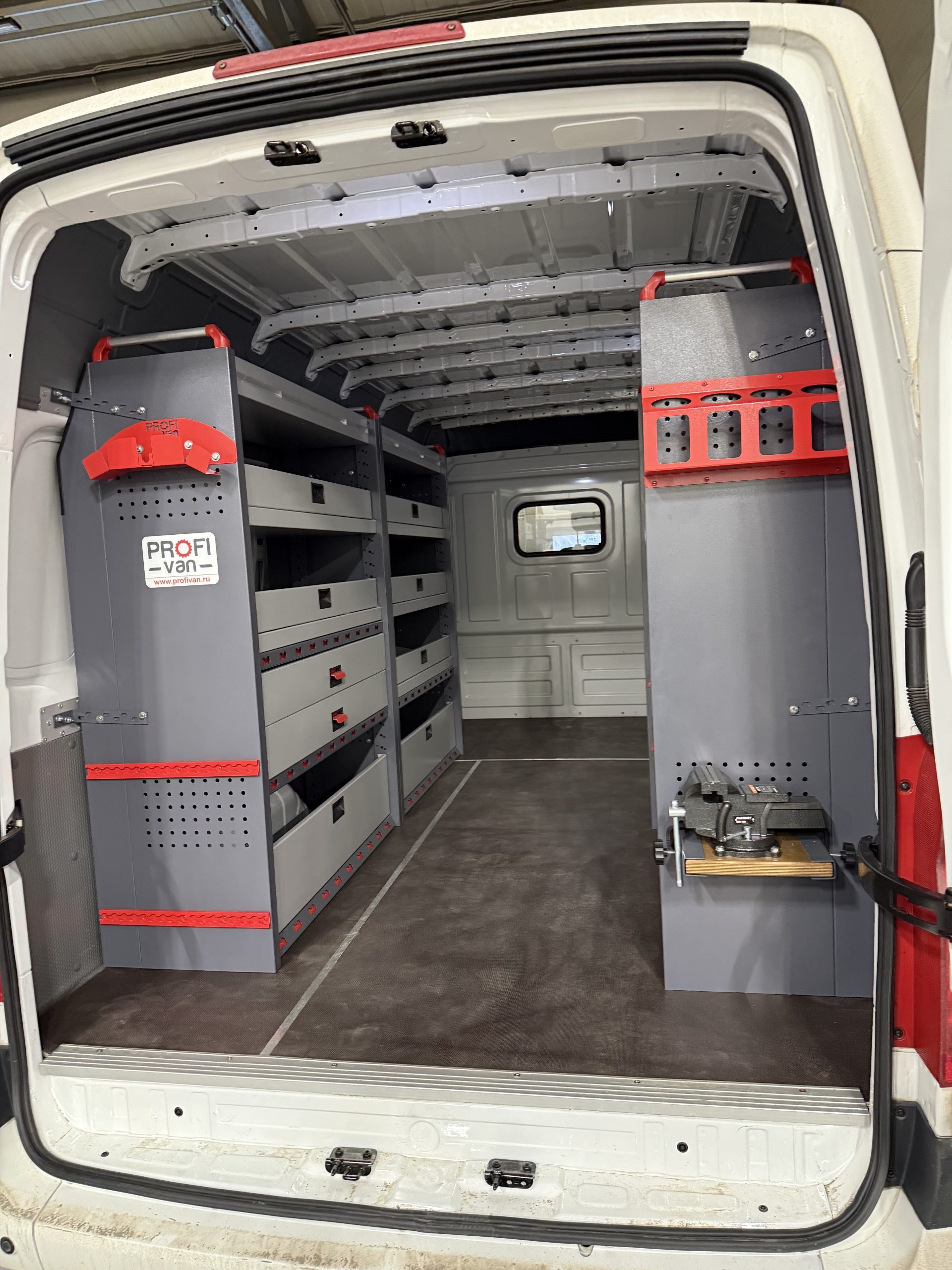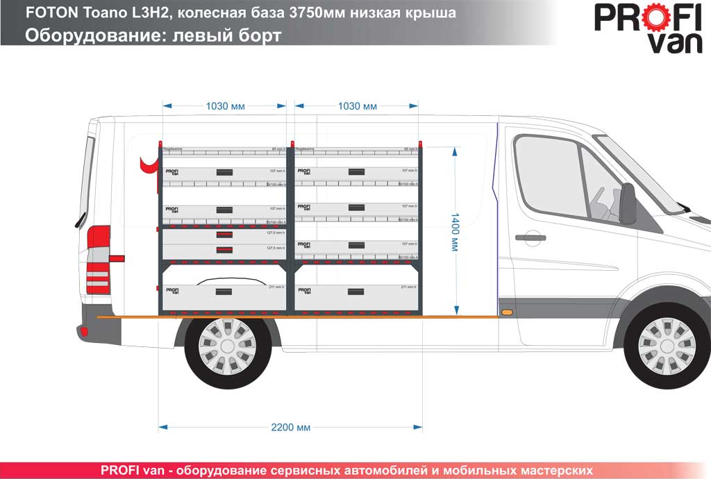 В автомобиль Foton Toano L3H2  для выездного сервиса сельхозтехники установили напольное покрытие из 12 мм ламинированной фанеры, По левому борту стеллаж с полками и выдвижными ящиками.  По правому стеллаж 1100 мм с выдвижным верстаком  с тисками 125 мм н 2 выдвижными ящиками. Дополнительно укомплектовали автомобиль канистрой 10 л с краном и держателем  для чистой воды, крепежными ремнями 3,5 м с храповым механизмом.