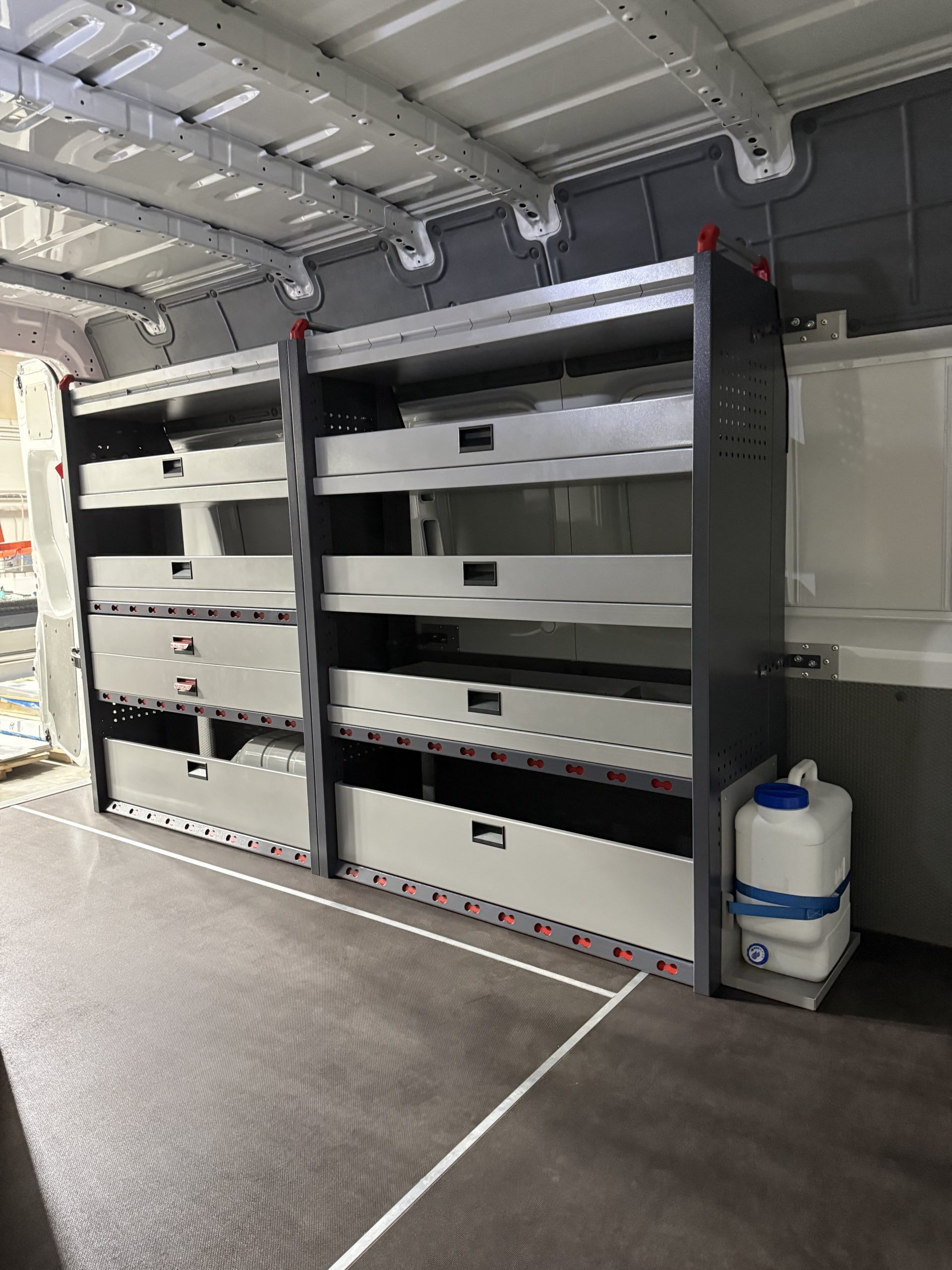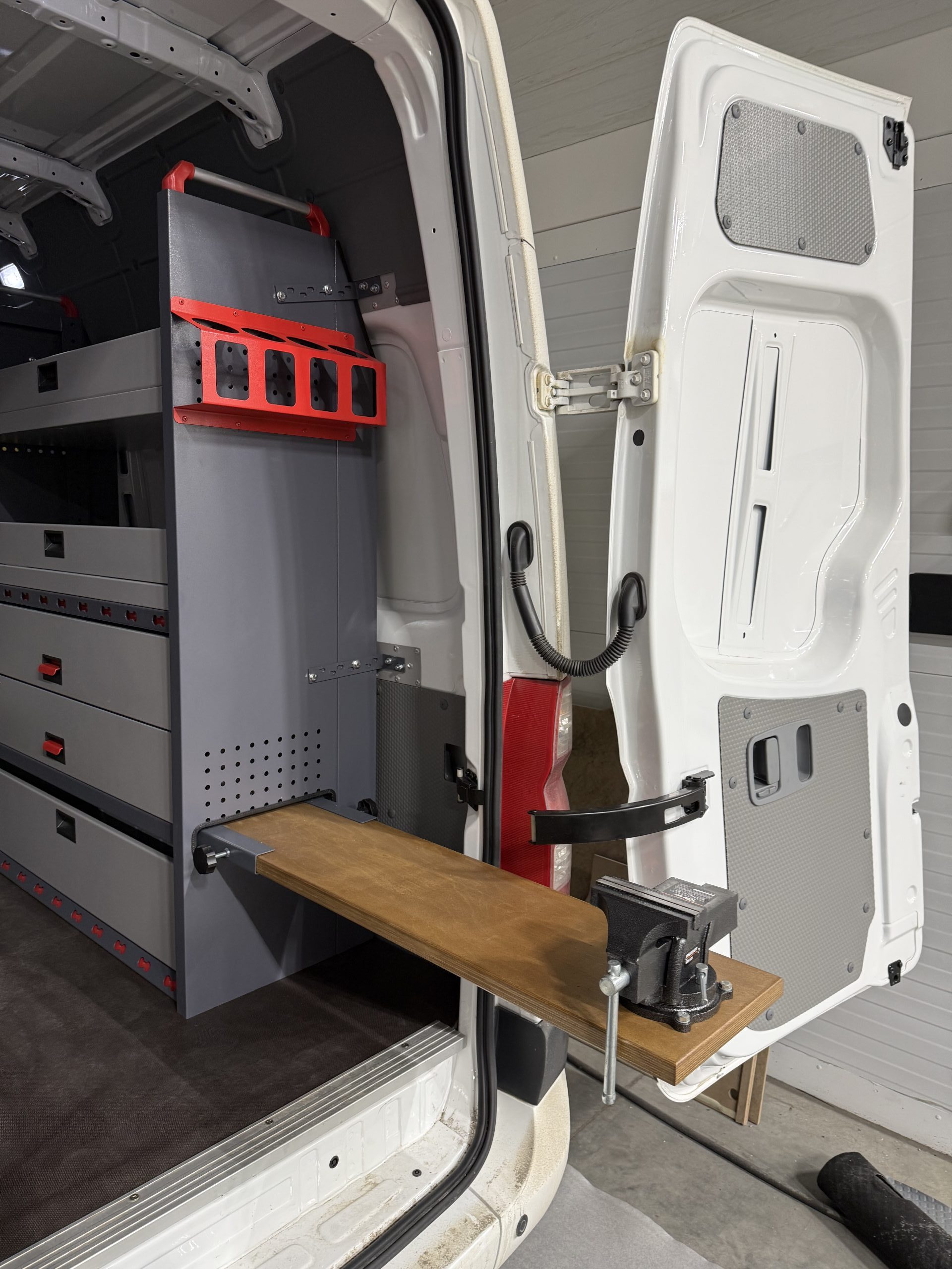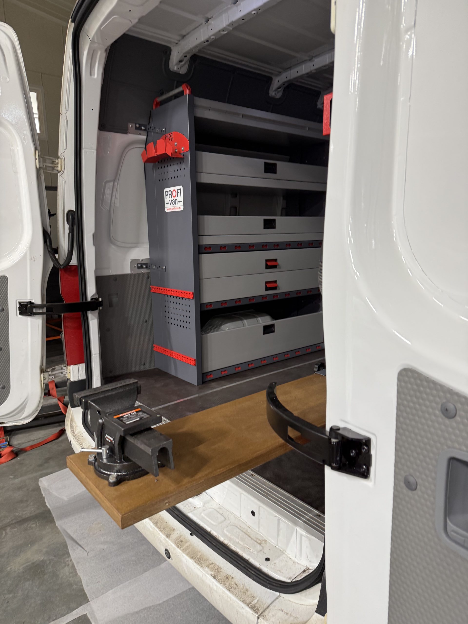 В автомобиль Foton Toano L3H2  для выездного сервиса сельхозтехники установили напольное покрытие из 12 мм ламинированной фанеры, По левому борту стеллаж с полками и выдвижными ящиками.  По правому стеллаж 1100 мм с выдвижным верстаком  с тисками 125 мм н 2 выдвижными ящиками. Дополнительно укомплектовали автомобиль канистрой 10 л с краном и держателем  для чистой воды, крепежными ремнями 3,5 м с храповым механизмом.