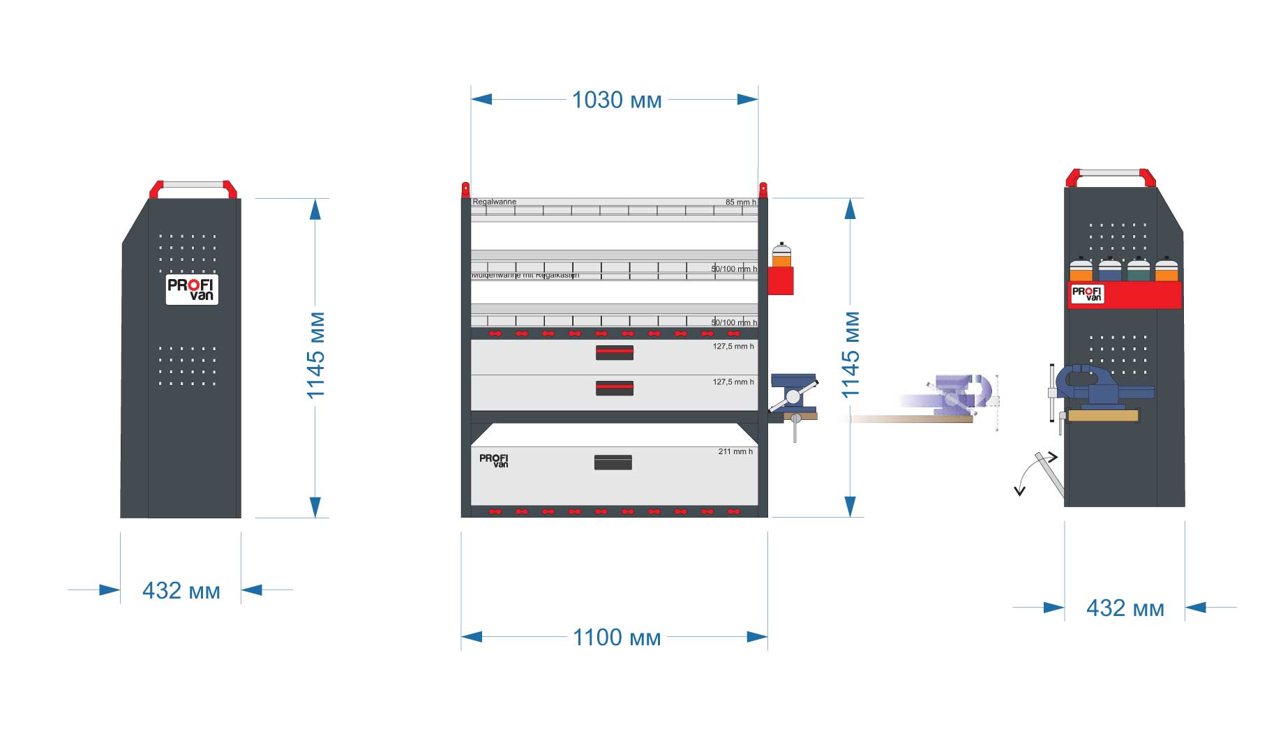 2 выдвижных ящика шириной 1030 мм и высотой 127,5 мм с резиновым ковриком и 2 делителями